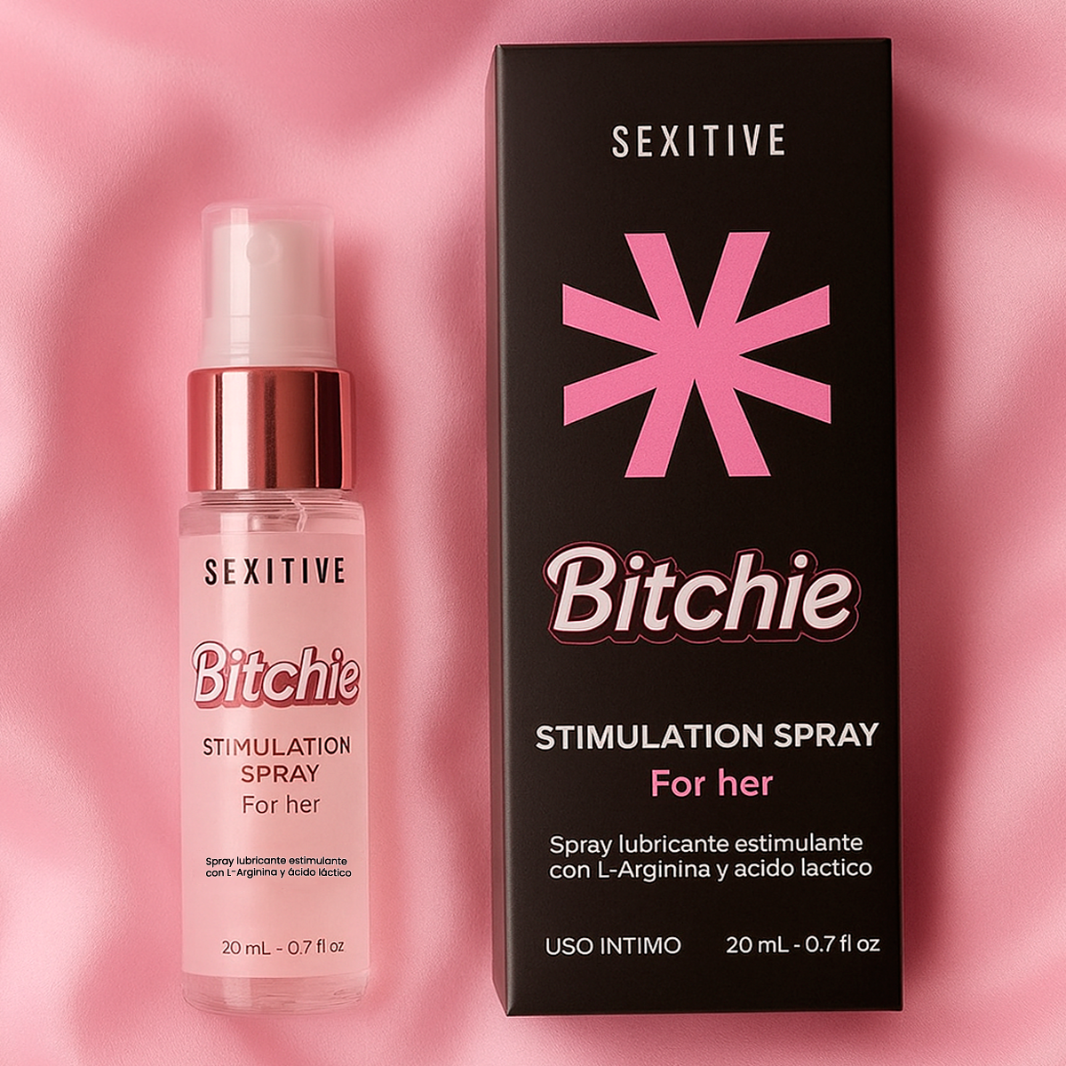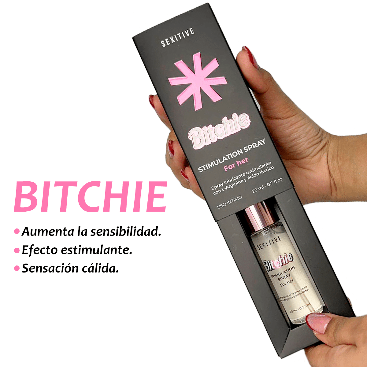 Diseñado para potenciar la sensibilidad y despertar el deseo, Bitchie activa tus zonas más íntimas con una sensación cálida, vibrante y profundamente placentera. Su fórmula exclusiva con L-Arginina y ácido láctico estimula la circulación y mejora la sensibilidad de la piel, logrando una respuesta más intensa y natural al contacto, con solo una o dos pulverizaciones, tu cuerpo se enciende y cada momento íntimo se convierte en una experiencia inolvidable.