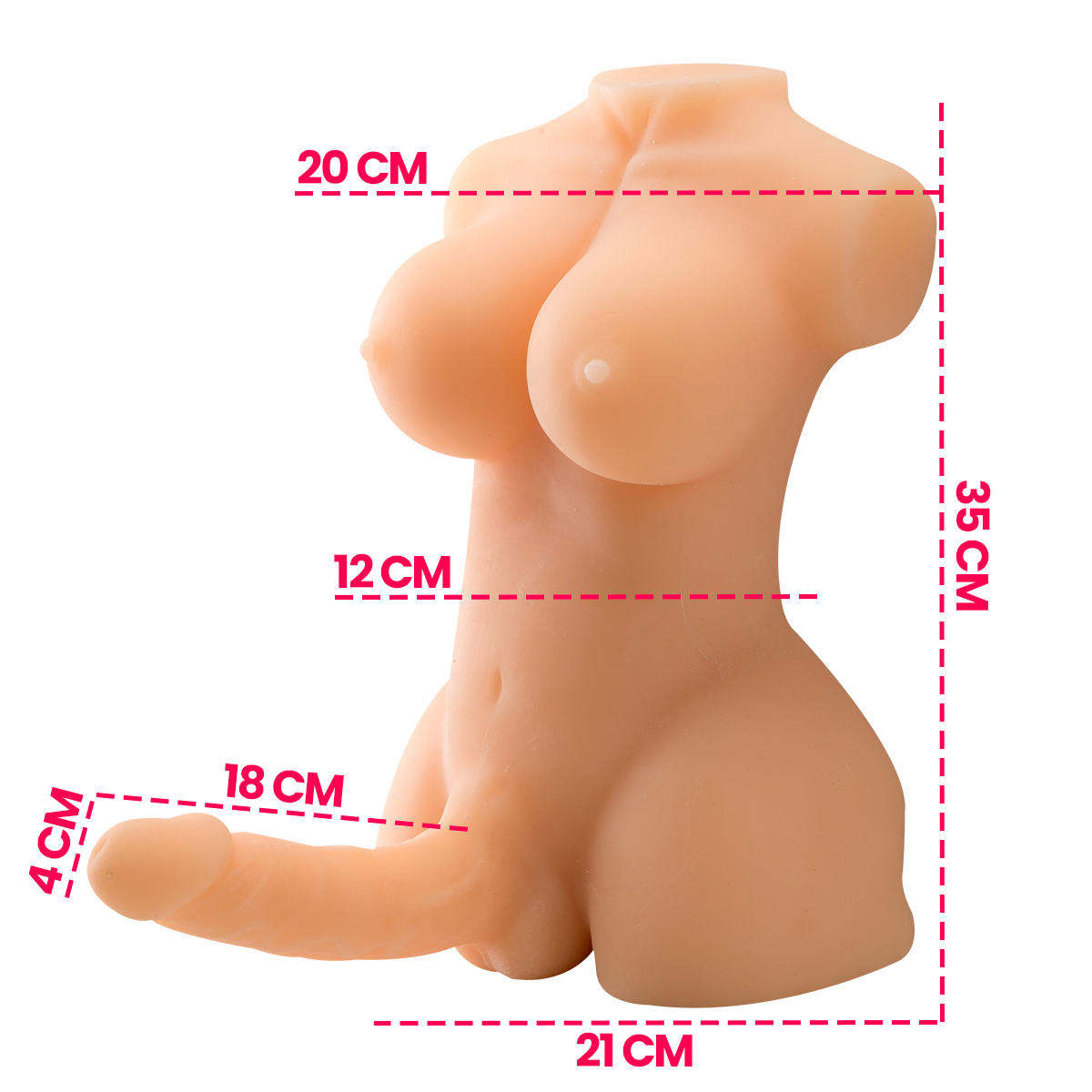 Experimenta un placer completo con este torso sexual trans, diseñado para satisfacer a mujeres, hombres, parejas y todo tipo de orientaciones sexuales. Cuenta con un enorme consolador realista, pechos y nalgas, combinando sensualidad y realismo en cada detalle. Su cintura pequeña y contorneada ofrece una experiencia visual y táctil única, mientras que el consolador grande, flexible y con punta curvada, estimula perfectamente los puntos G y P, así como para juego anal.